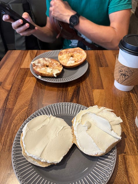 While waiting, we had breakfast just next door: two bagels, one with cream cheese and one with butter. Pretty good food. Coffee, not so much.